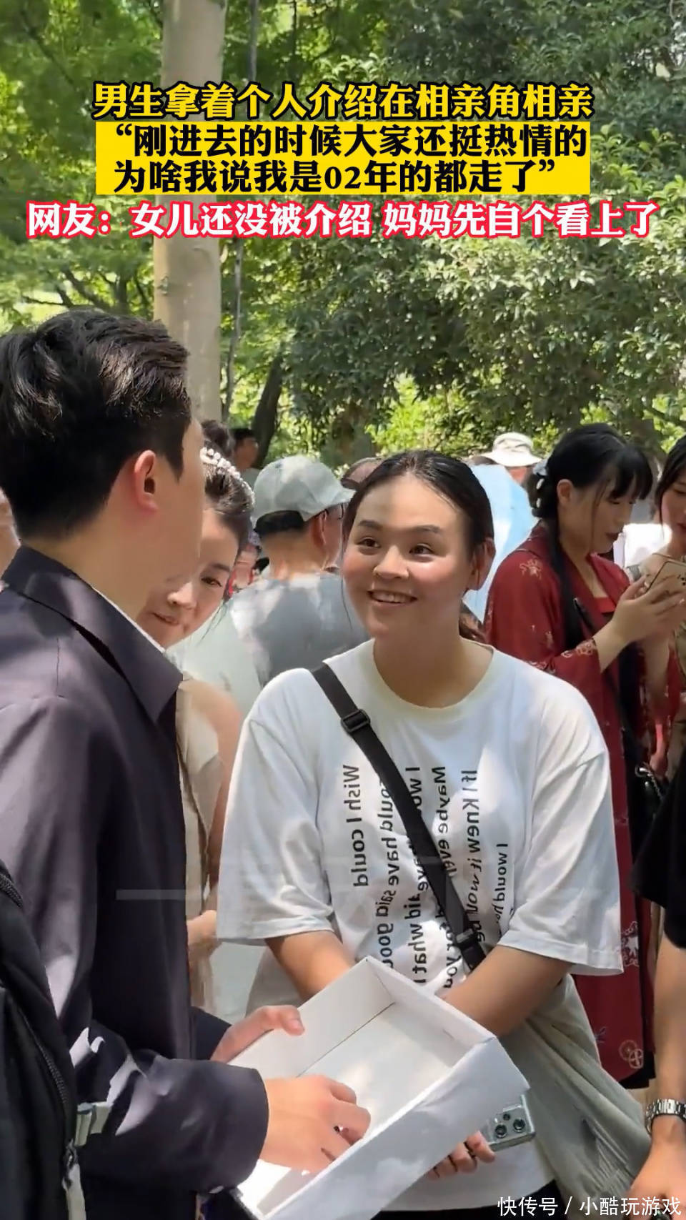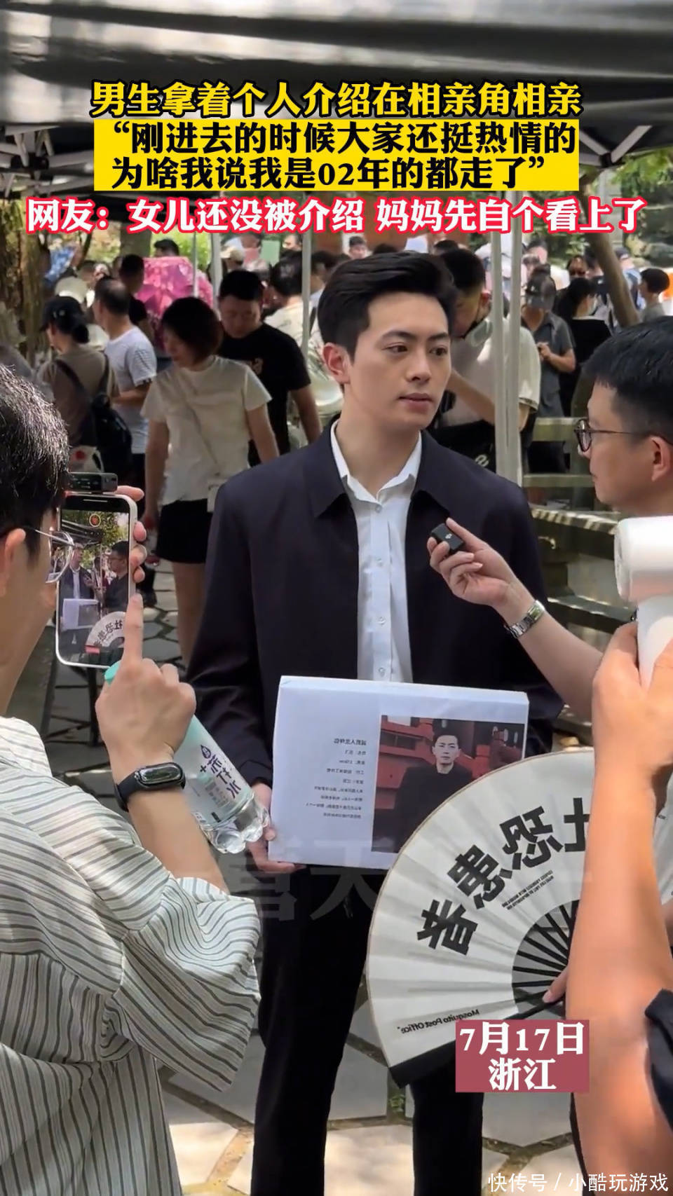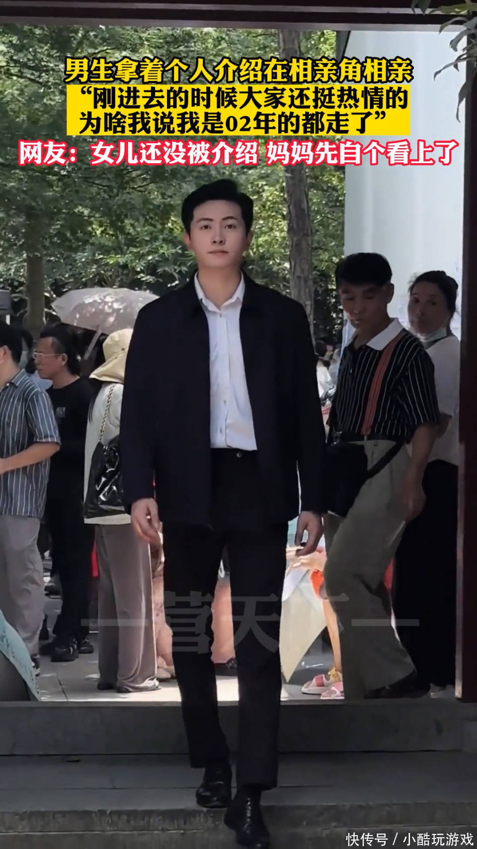 视频画面中男子拿着个人介绍到相亲角相亲,刚开始大家看着他穿着行政夹克,表现得“局里局气”的样子也很是热情,纷纷争先上前了解小伙的具体情况,可是当得知男子实际年纪后,众人反差巨大。